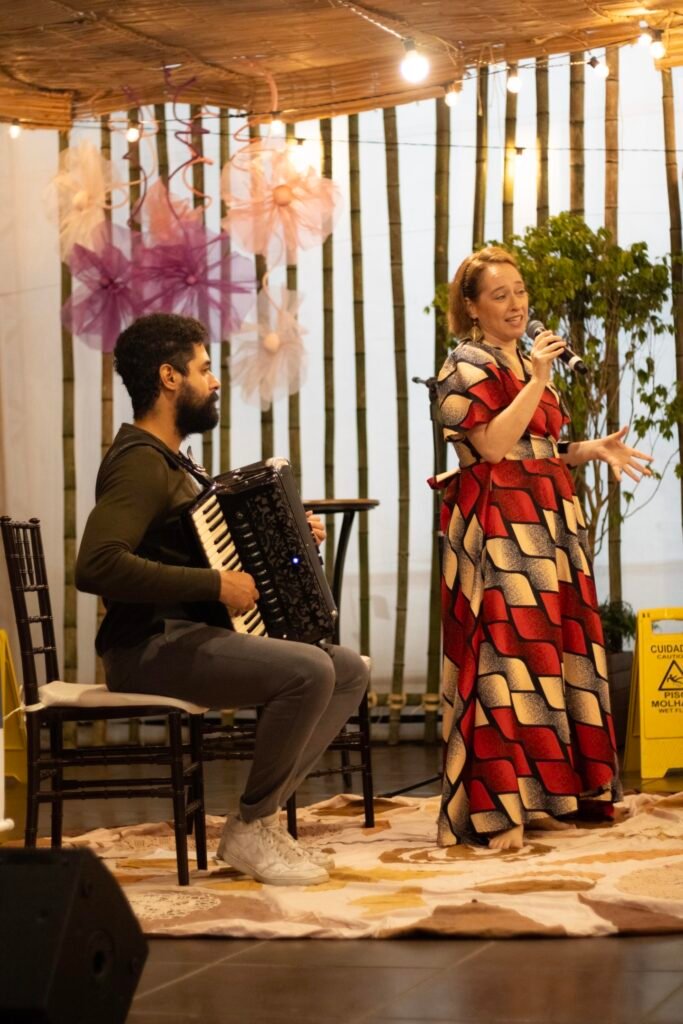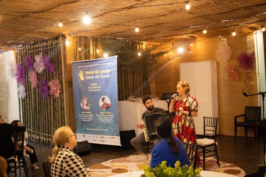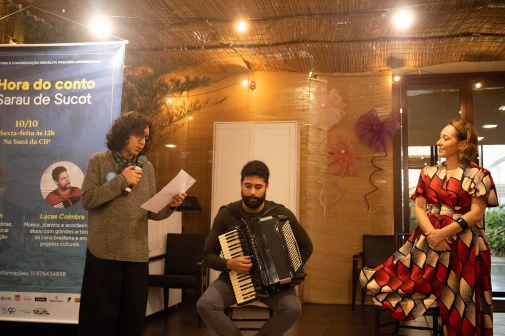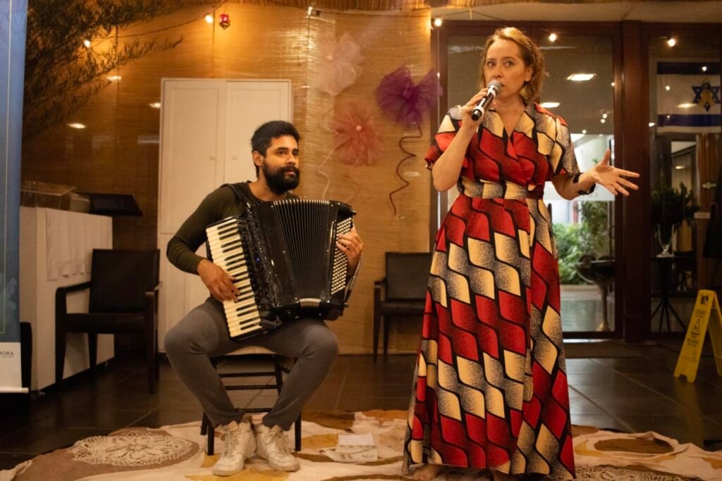 A atriz e narradora de histórias Dinah Feldman, com sua presença carismática e longa trajetória dedicada à tradição judaica, conduziu uma envolvente apresentação de contos que atravessam gerações. Suas narrativas, acompanhadas pela sensível trilha musical do pianista e acordeonista Lucas Coimbra, ecoaram temas universais como fé, coragem, memória e pertencimento, tocando o coração de todos os presentes.