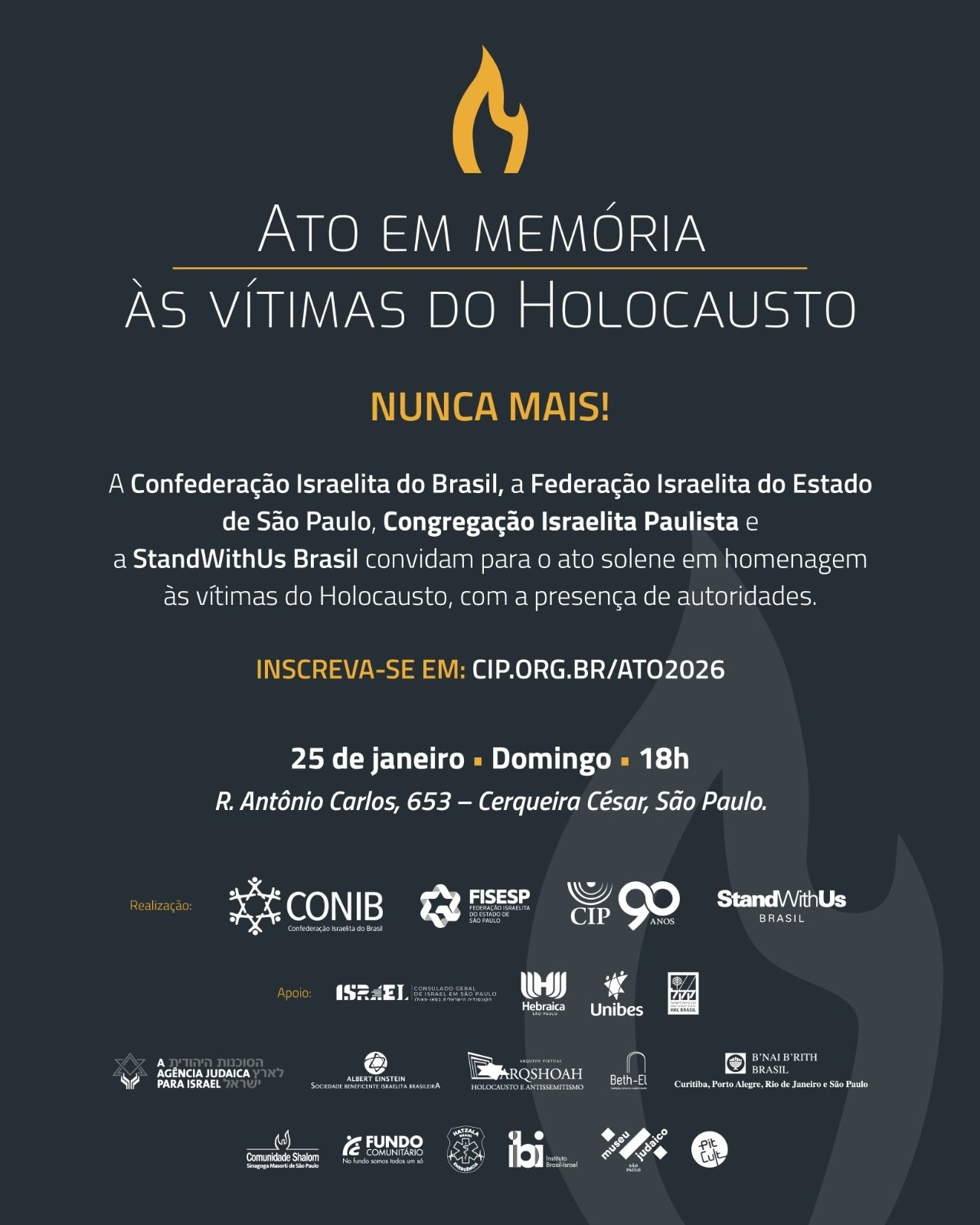 O evento é uma realização da Confederação Israelita do Brasil (CONIB), da Federação Israelita do Estado de São Paulo (Fisesp), da Congregação Israelita Paulista (CIP) e da StandWithUs Brasil, com a presença de autoridades, lideranças comunitárias e representantes da sociedade civil.