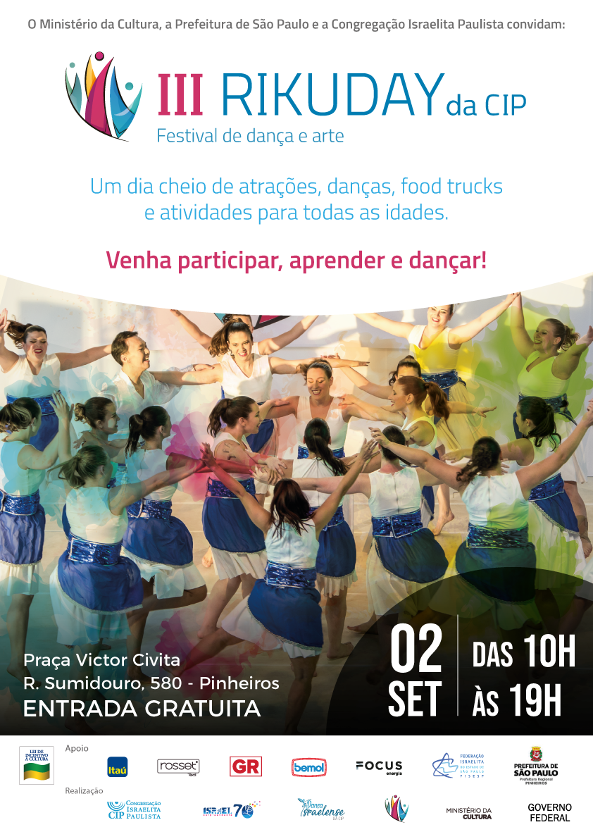 No dia 2 de setembro, a partir das 9h, acontecerá o III Rikuday (Festival de dança e arte). Será um dia repleto de atrações, danças e atividades com a intenção de valorizar e estimular a nossa juventude judaica. Venha participar, aprender e dançar!