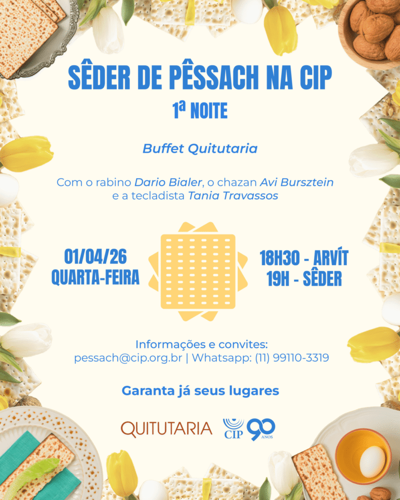 A CIP convida a comunidade para celebrar o Sêder de Pêssach na primeira noite da festividade, em um encontro especial que une tradição, música e convivência.