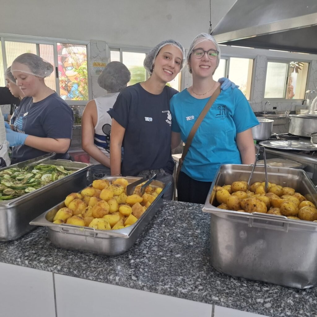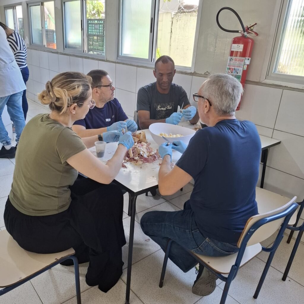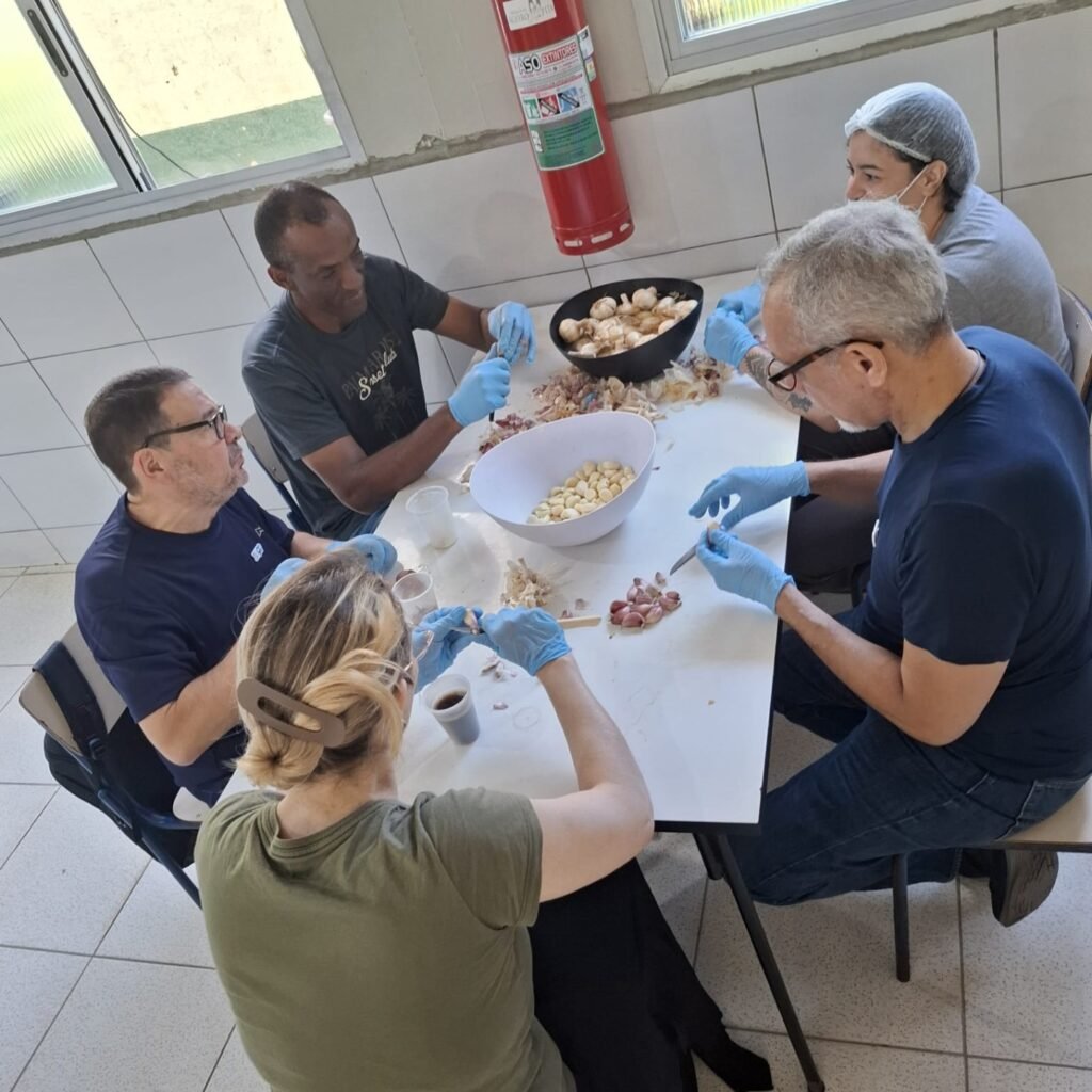 Além da entrega das doações, os jovens e voluntários também dedicaram parte do dia ao serviço no refeitório, ajudando na organização e no atendimento durante o almoço oferecido aos frequentadores da instituição.